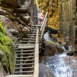 Capture nature’s beauty at its finest with a Photo-Op at Flume Gorge in Franconia Notch State Park. This stunning natural chasm features towering granite walls, cascading waterfalls, and wooden walkways winding through lush forest scenery. Every angle offers a postcard-perfect shot—making it a must-stop destination for photographers and nature lovers alike.